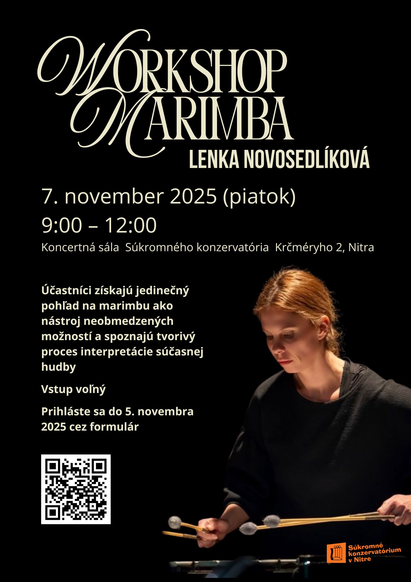 Účastníci získajú jedinečný pohľad na marimbu ako nástroj neobmedzených možností a spoznajú tvorivý proces interpretácie súčasnej hudby.